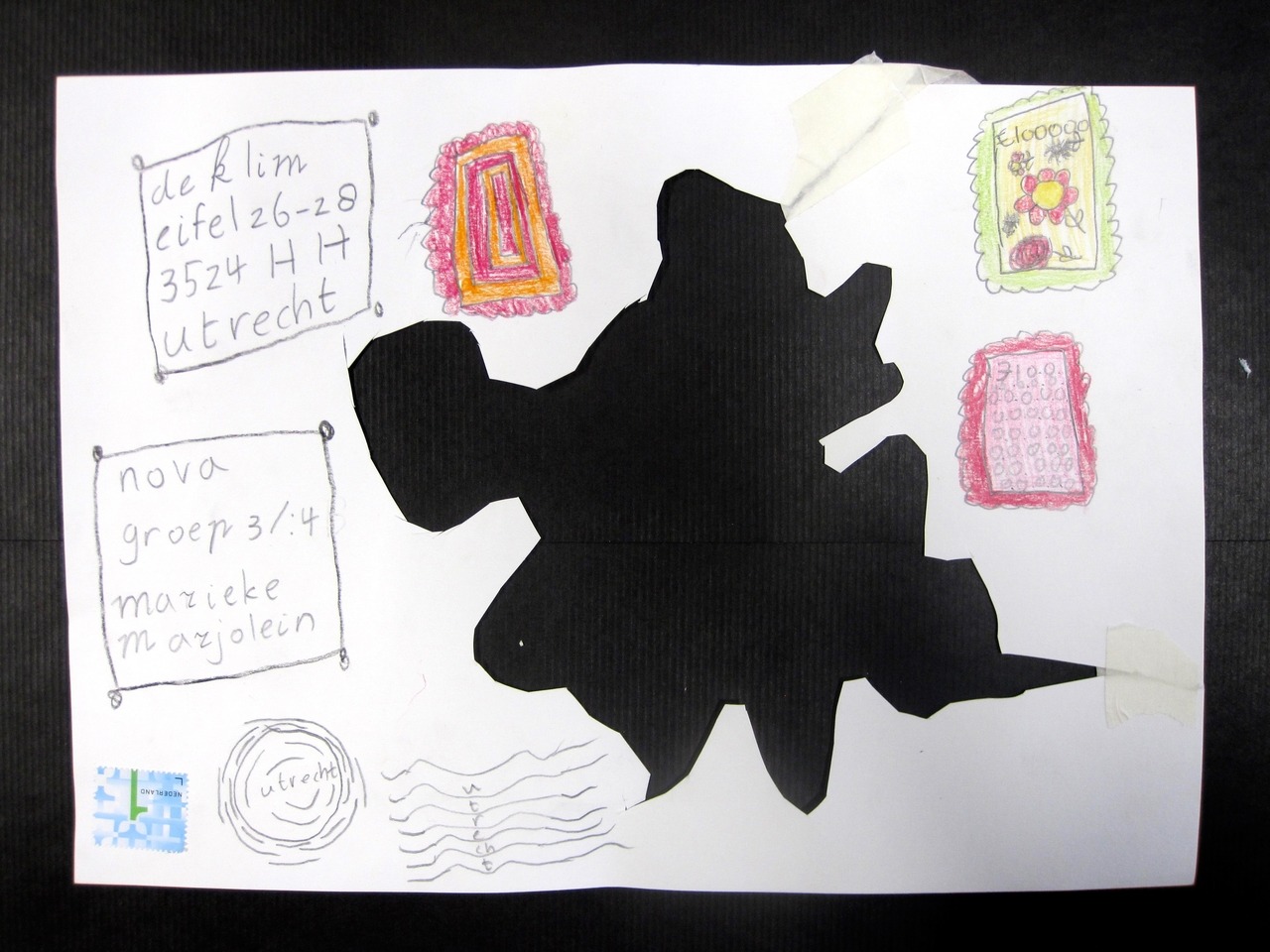 Vandaag gaan we onderzoeken of niets ook kan reizen. De opdracht is om een gat te maken in een vel papier, postzegels te tekenen en het adres er op te schrijven. Om het vervolgens per post van Amsterdam naar Utrecht te versturen.